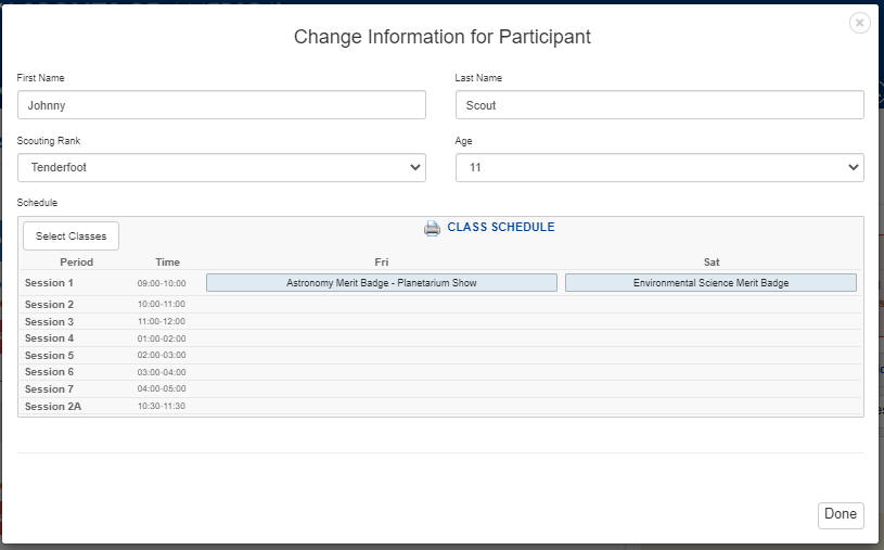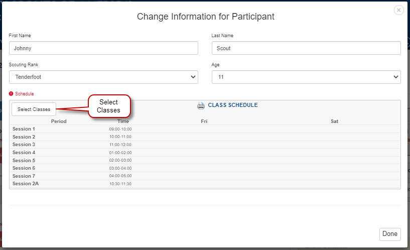 Step 3. When you have entered the Scout's name, rank and age, Click Select Classes